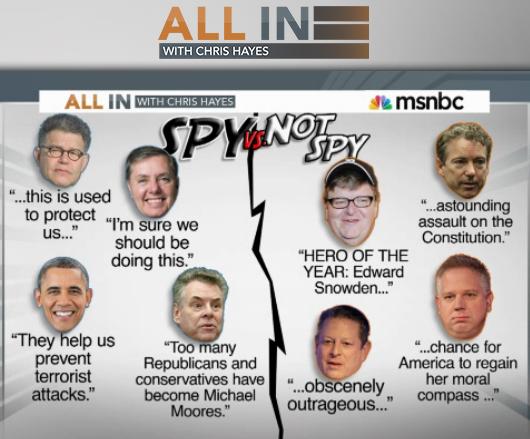The odd politics of support for the NSA’s intelligence gathering/data mining program, from Chris Hayes’ “all In” program.