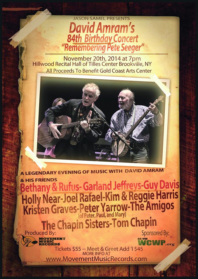 Come and enjoy the greatest folk concert Long Island has seen in decades. The evening’s performers will include David Amram and his quintet (David Amram, Kevin Twigg, Rene Hart, Robbie Winterhawk and Adam Amram) as well as friends he shared with the late Pete Seeger including Peter Yarrow (of Peter, Paul, and Mary), Tom Chapin, Holly Near, Guy Davis, Garland Jeffreys, Kim & Reggie Harris, Joel Rafael, The Amigos, The Chapin Sisters, Bethany & Rufus and the Connecticut State Troubadour Kristen Graves. Net proceeds will benefit the 501 (c)(3) not for profit Gold Coast Arts Center, a not for profit organization dedicated to supporting and promoting the arts through education, exhibition, performance and outreach.