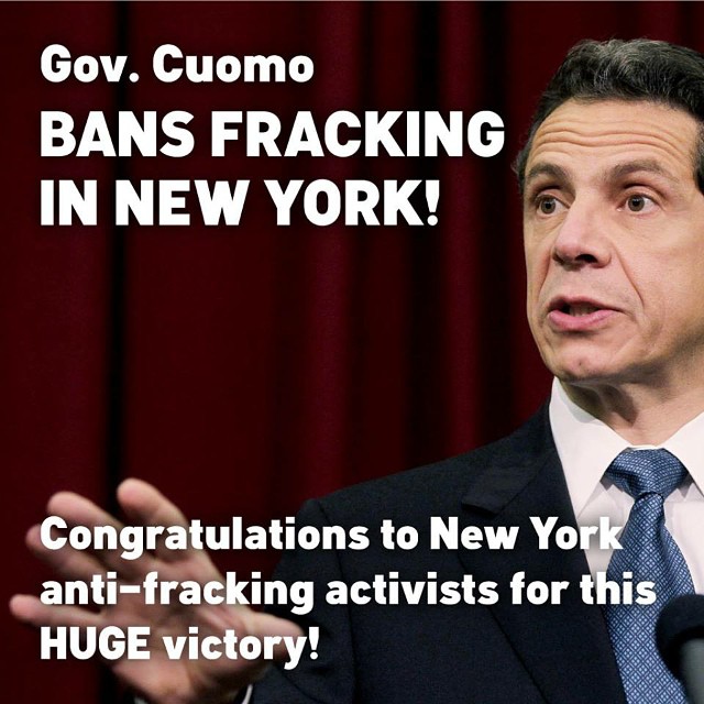 Today (December 17), New York Governor Andrew Cuomo made it clear that New York State would not allow fracking. There is shock and joy among my friends who’ve fought against fracking. The joy part is obvious. The shock is that Cuomo caved. He had been crafting a series of end-run ways to bring in fracking upstate. This was everything from pushing for test fracking sites to handing over the writing of his infamous ‘frackonomics’ report to a pro-fracking PR firm. New York was also the only one of the 50 states to lack adequate rules about the dumping of fracking waste on public roadways and right-of-ways. He had also ‘solved’ an impasse over casinos with the Oneida Indian nation by having their land revert to federal control–a back-door way of allowing fracking in their lands (federal law does not prohibit fracking). Getting Cuomo to do the right thing looked like a lost cause. And to be fair, his decision also hasn’t made him popular with the pro-fracking crowd. At least one blogger has gone so far as to state that Cuomo is on the Saudi’s payroll, since the Kingdom would benefit from fracking not going forward in the US.
