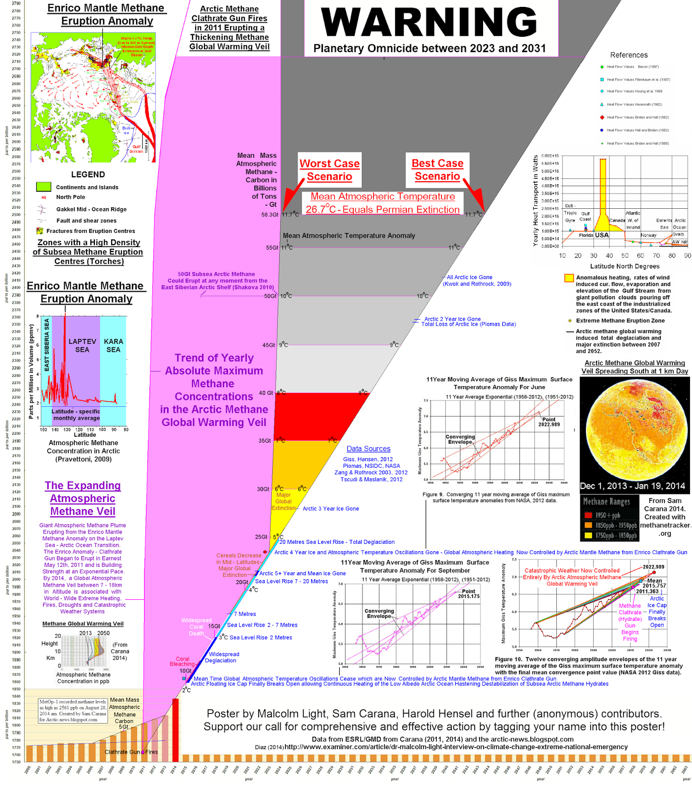 This week, people who are following issues with ‘climate change’ were treated to numerous articles reporting that atmospheric levels of c02 seem to be fixed levels of 400 parts per million. But there was almost no reporting on what 400 ppm of carbon means to the atmosphere–or prospects for continued life on the planet. The potential guests I tried to round up on this topic (all staunch defenders of the mainstream climate pov, including government reps) all begged off. So (as a public service): these are the issues you should be bringing up every time politicians bring up ‘climate change’. Because if the climate has changed as much as these scientists say it has (and if anything, I think they’re being conservative) then there’s a word that should be in their vocabulary–Extinction.