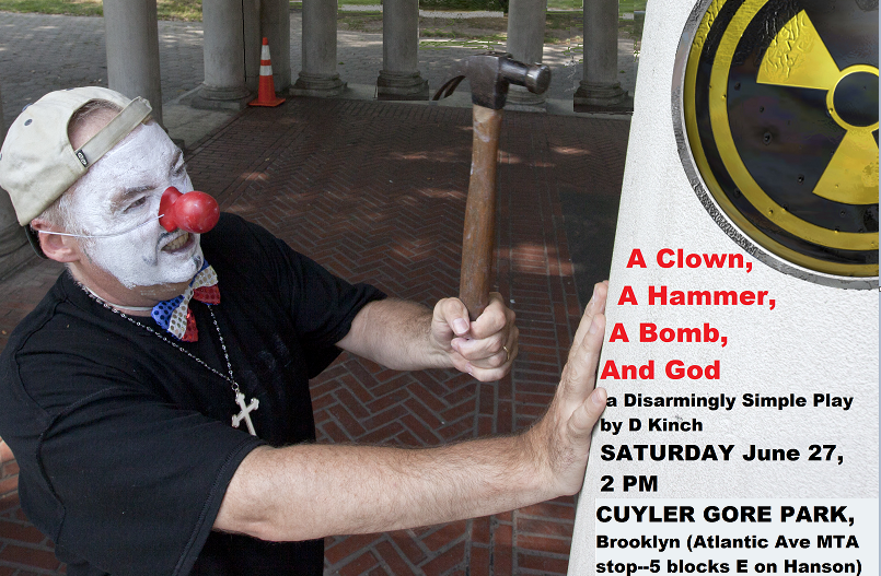 This coming Saturday I will once again don whiteface and a clown nose and tell people the story of a clown, a hammer, a bomb, and God. It is about a pacifist priest named Carl Kabat who disarmed a Minuteman III missile on Good Friday 1994 (which was also April Fool’s Day) while wearing a clown suit. It has been done a lot over the years, but it went on hiatus back in the ‘aughts’ because if you promote peace, the terrorists win. There’s more about its storied history here. I revived it after the Occupy Wall Street movement got started because, hey, protest is protest. Also, in all the condemnations of the 1% over their economic chicanery, we seem to have forgotten that the empire has some 1,950 nuclear missiles armed and ready to fire off at a moment’s notice. Since the estimates are that a mere 500 such explosions over the world’s largest cities would put us back to the Dark Ages in terms of population and economy, that’s no small power to cede to people in suits.