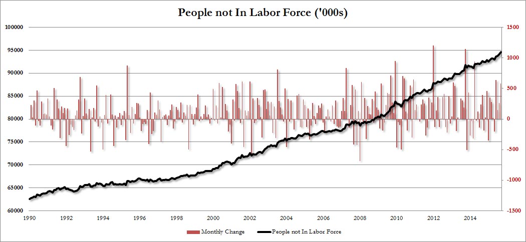 Since I seem to be in update mode, I thought I’d share this. I’ll try to keep things simple. Back in May I wrote that a count of adults unemployed or underemployed in the current economy indicated that there were some 93 million working age Americans who weren’t in the workforce in any reasonable way (or any way that would support themselves). I was wondering when someone would revisit those statistics. Yesterday’s jobless figures were out again, and they were buried under the headlines of the shootings in Oregon. But the numbers are not good. Per this overview, we added 142,000 jobs, which is around the 125-150 K we need to keep even with population growth. But August employment numbers were revised downward, from 200,000 to 136,000. And Paul Craig Roberts points out that almost all the jobs added were in low-pay positions in retail and hospitality or service jobs, many of which are part time. And there’s a paradox in the retail jobs added–sales are flat right now, so why are retailers adding positions? Are they trading full-timers for part-timers? Remember that the BLS counts someone working an hour a week as ’employed’, even if that person is living in their car and eating at soup kitchens. Another bad sign is that average wages fell. That’s not consistent with an economy with an ‘official’ unemployment rate of 5.1%. But the big fall is in labor participation rate. Per Roberts, The labor force participation rate fell further and is now the lowest in about 40 years. This is especially damning when we remember that in those long ago years many more households could exist as one-earner households.