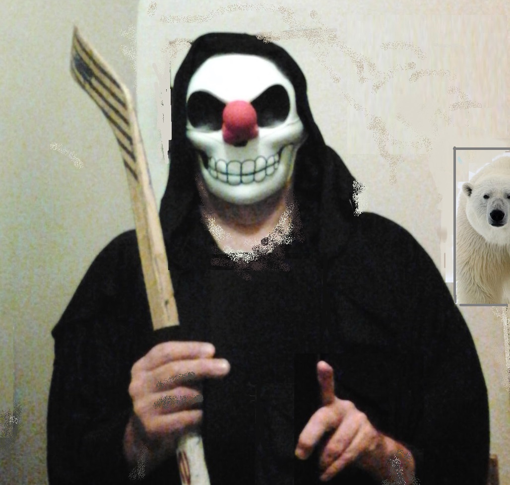 As a result of research that showed a distressing trend of humans toward their own demise, I decided I should write a play about it. So, about three years after I first embraced the idea of ‘Doomer Porn‘, I have written a play about the subject of near term human extinction. PLANET HOSPICE is a lecture on extinction given by an environmental biology scientist (a fictional chap named Dr. James Light) who’s been cashiered from his cozy university job because his lectures upset his students. He has been wrestling with the question of what people should do if in fact we’re on the way to eternity’s trash compactor–if in fact there will be no history after us because no one will be around to write it or read it. Dr. Light has given up on presenting his thesis in a scientific setting–people have found his message far too disturbing to even show up at his lectures. And so he now presents his case while dressed in clown garb–a mixture of Bozo and the Death Figure from Seventh Seal. And as a clown, he makes jokes. He makes balloon animals. He plays with puppets. He has a slide whistle, which he uses for punctuation. He tells jokes about death and eternity and the Kardashians. Anything to move the story along. And the story is bleak– Absent a miracle or three, we’re out of habitat for humans in as little as 15 years (less if we become unlucky in our dealings with nuclear weapons or we crash our economy to the point where everything goes off the rails).
