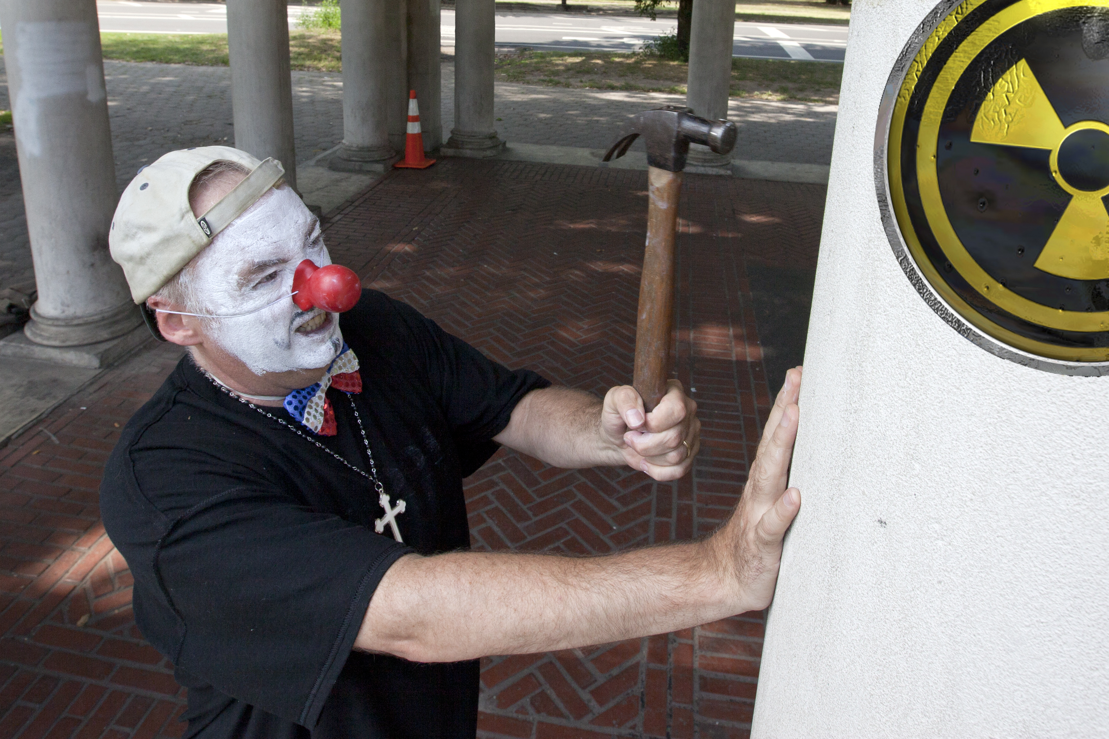 This is an excerpt from my play A CLOWN, A HAMMER, A BOMB, AND GOD. A CLOWN, A HAMMER, A BOMB, AND GOD is about a pacifist priest named Carl Kabat who disarmed a Minuteman III missile on Good Friday 1994 (which also fell on April Fool’s Day that year) while wearing a clown suit. There’s more about its storied history here. When the play was first performed in 1997, the Cold War was over and the reasons for keeping the weapons were few. Now the US seems bound and determined to get involved in war sufficient to lead to the splitting of atoms. The Russians are not afraid of us, and will not roll over. Thus, the play (although dated in certain ways) is as timely as it was when it first opened at the New York Fringe Festival.
