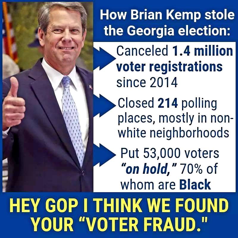 The real voter fraud in 2018 was carried in the open with everyone watching. And not a single haberdasher or costumer was involved. It was all about disenfranchising voters who wouldn’t support the GOP agenda. This meme has made the rounds, and Greg Palast’s website verifies these talking points about the Georgia race for Governor: