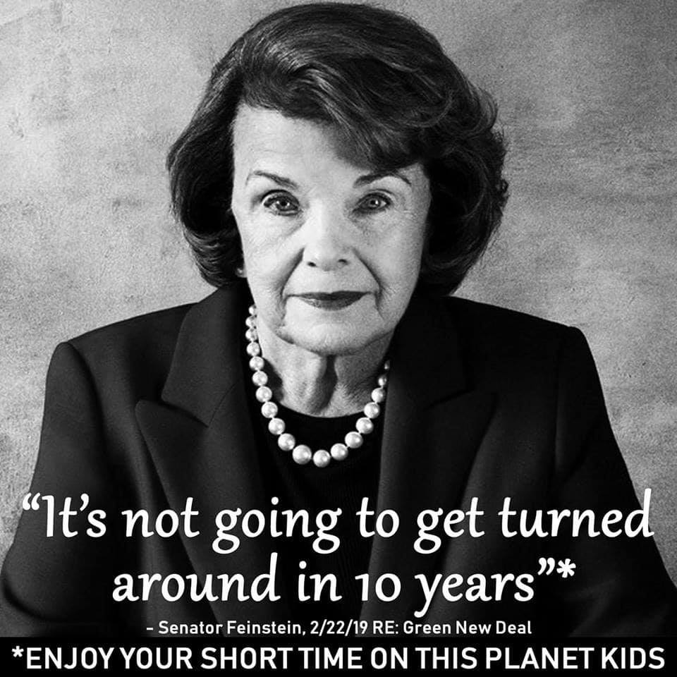 So THIS happened–a group of earnest committed young people went to Senator Dianne Feinstein’s office to ask her to sign on for the ‘Green New Deal‘ program being pushed by progressive Democrats like Alexandria Ocasio-Cortez and Bernie Sanders (technically not a Democrat, but Progressives will take you if you’re warm). Things went badly. Someone took some video, and in the viewing, Feinstein doesn’t… come across like someone who’s speaking to future voters or even the children of current voters. Reminds me of an article I wrote recently where I said the leadership all knew that we’re facing extinction in a very near term. Feinstein’s statement that IT’S NOT GOING TO GET TURNED AROUND IN TEN YEARS (she’s referring to global warming) is certainly an interesting tell…