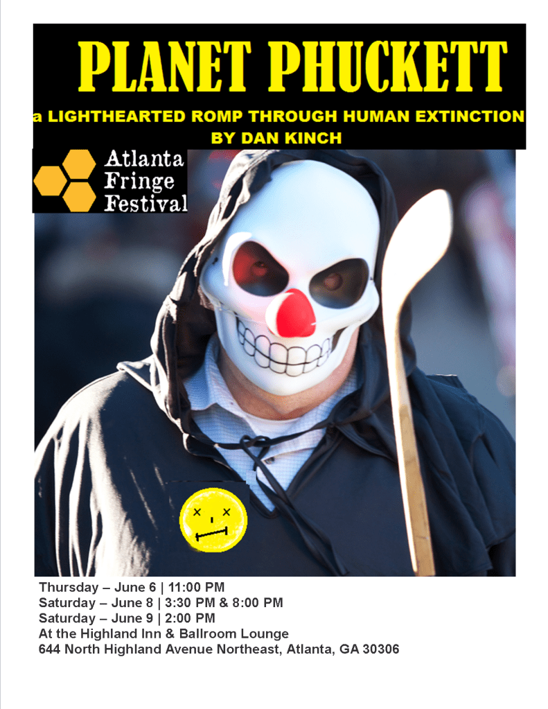 So with the Good Doctor’s permission, I wrote a play based on his work titled PLANET HOSPICE (Now Planet Phuckett because there’s a punk rock group named Planet Hospice). I’ve performed it about 20 times and it makes people depressed, but I thought I owed it to people to let them know the future we’re all facing. I couldn’t Get audiences in Atlanta Fringe. My next known performance is in February. I wonder what the turnout will be like.