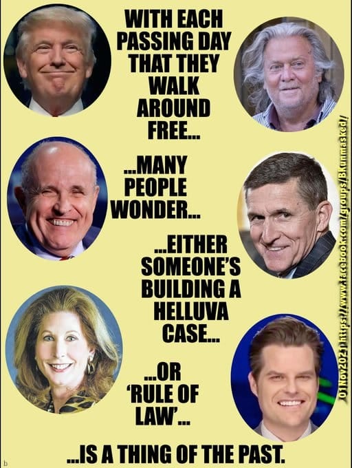 I’m highly pissed off. I don’t think I need to explain this, so I borrowed this graphic from FB, where someone shared it a few days ago. And while it is mostly about Trump and his cronies, Matt Gaetz is featured and his plethora of crimes haven’t been prosecuted. It was a reminder that ten months after the first presidential insurrection attempt IN HISTORY, the perpetrator and his willing supporters haven’t been indicted.