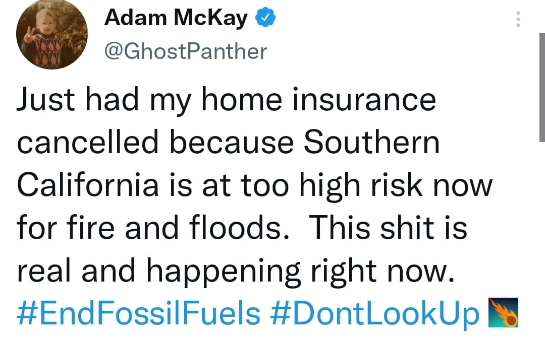 And thus,McKay finds one component of the doom aspect of DON’T LOOK UP not covered in his film. Who thinks we’ll survive a catastrophic event? And the insurance underwriters are far smarter than his fictional president Orleans–they know that coming disaster will leave them on the hook for trillions. There have been similar non-coverage problems in Louisiana and Long Island, where insurers stop writing policies. My FB friend Kevin Hester has stated the end of insurance is the end of capitalism: “For the insurance industry, global warming has advanced from a future ecological challenge to a present financial shock. Together, total losses to the economy from natural catastrophes and “man-made disasters” reached $165 billion in 2018; that followed a 2017 that, at $350 billion, cost more than twice as much. As a result, according to the Swiss Re Institute, the company’s research arm, 2017 and 2018 were for insurers the most-expensive two-year period of such catastrophes on record, requiring them to fork over $219 billion globally in checks.”